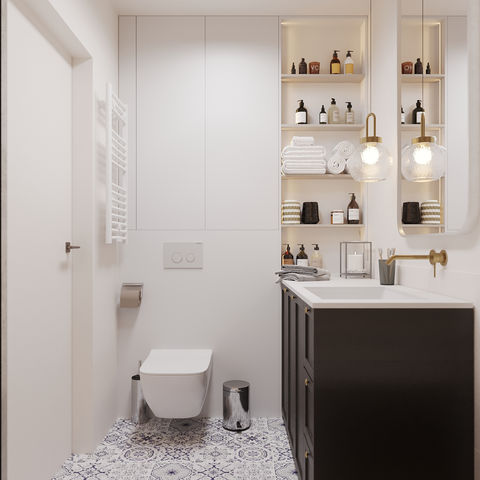 Łazienka to symbioza stylu i wygody. Klasyczne zestawienie kolorów przełamane drewnem i złotem tworzy przestrzeń, która jest zarówno praktyczna, jak i luksusowa.