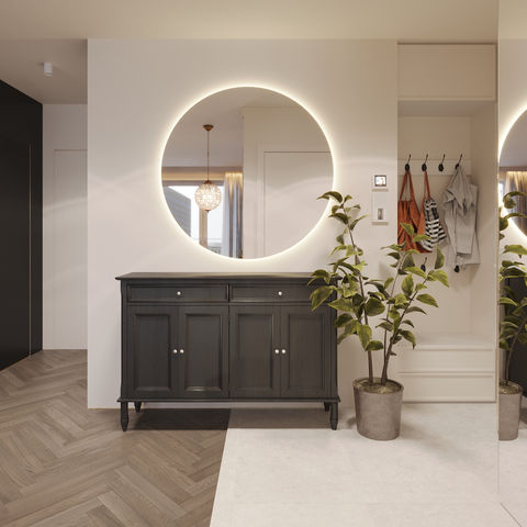 Salon łączy nowoczesny szyk z klasycznym ciepłem. Kontrasty barw i faktur tworzyą wyjątkowy klimat, a wygodna sofa i subtelne oświetlenie zachęcają do odpoczynku.